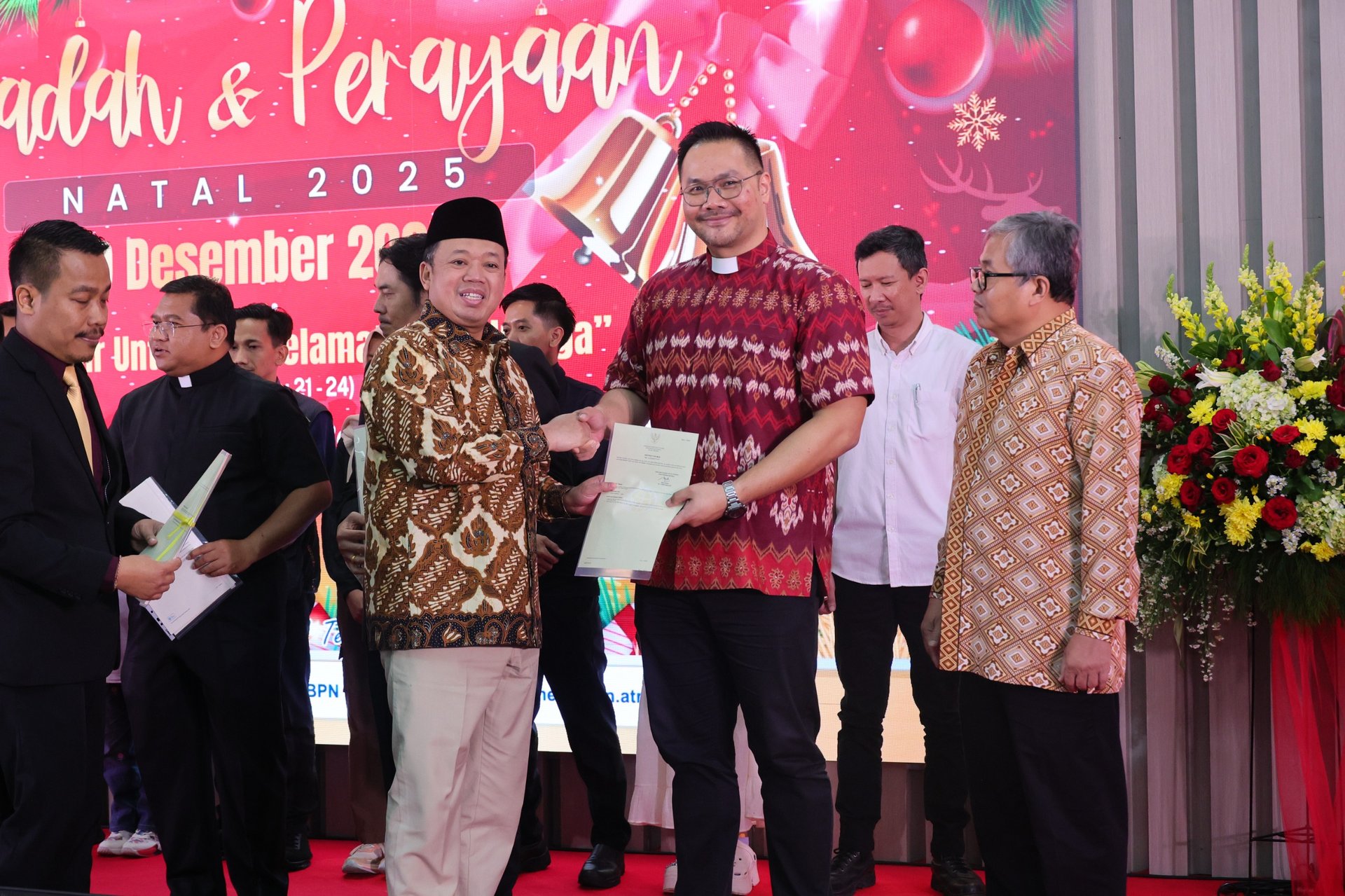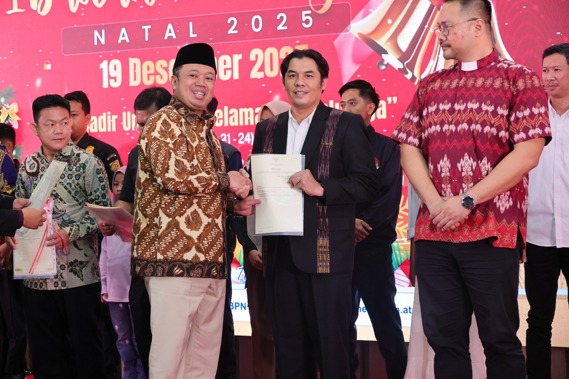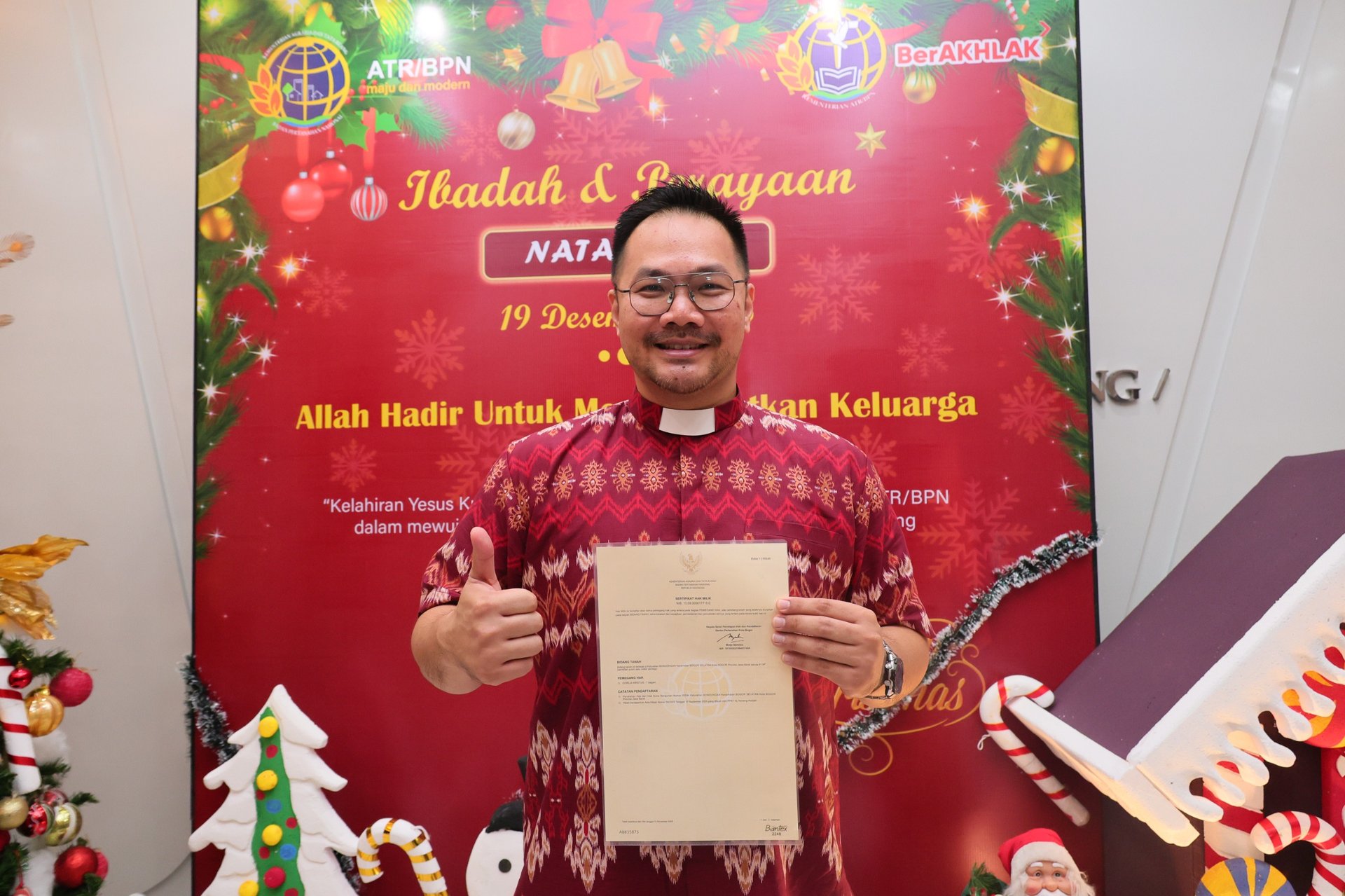 Jakarta - Dalam Perayaan Natal Kementerian Agraria dan Tata Ruang/Badan Pertanahan Nasional (ATR/BPN) Tahun 2025, Menteri ATR/Kepala BPN, Nusron Wahid, menyerahkan 14 Sertipikat untuk Rumah Ibadah dan Yayasan Kristiani kepada delapan penerima. Pendeta Maruli Sinaga dari Gereja Kristen Protestan Simalungun (GKPS) sebagai salah satu penerima menyatakan, dirinya merasakan betul dukungan dan kemudahan proses pengurusan sertipikat untuk gerejanya.