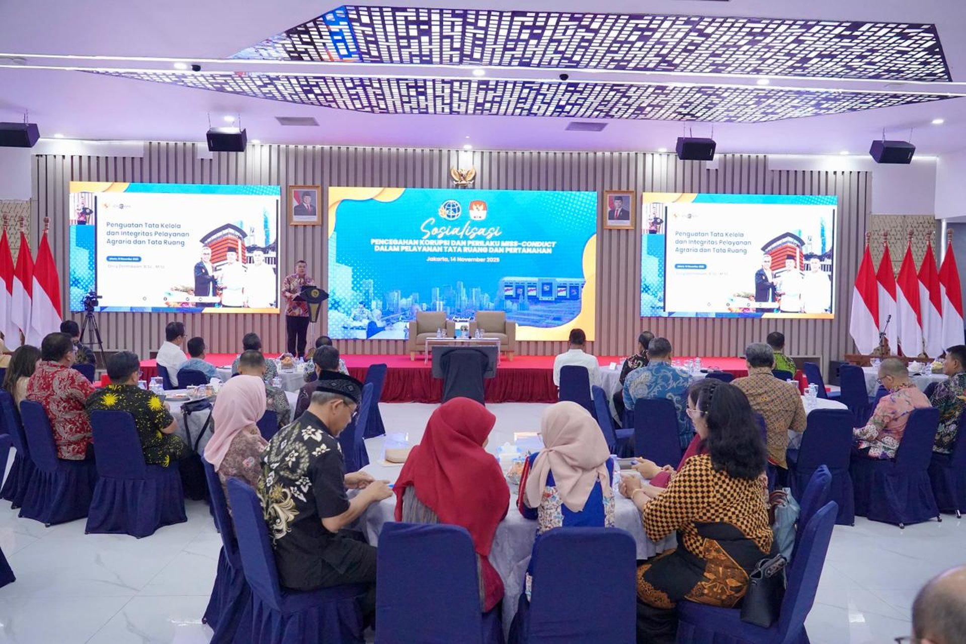 Jakarta - Wakil Menteri Agraria dan Tata Ruang/Wakil Kepala Badan Pertanahan Nasional (ATR/BPN), Ossy Dermawan, menekankan pentingnya memastikan seluruh proses layanan pertanahan berlangsung secara transparan, terukur, dan konsisten dengan ketentuan yang berlaku. Pernyataan tersebut disampaikan saat membuka Sosialisasi Pencegahan Korupsi dan Perilaku Missconduct yang diselenggarakan Kementerian ATR/BPN bersama Komisi Pemberantasan Korupsi (KPK), Jumat (14/11/2025) di Aula Prona, Kantor Kementerian ATR/BPN, Jakarta.
