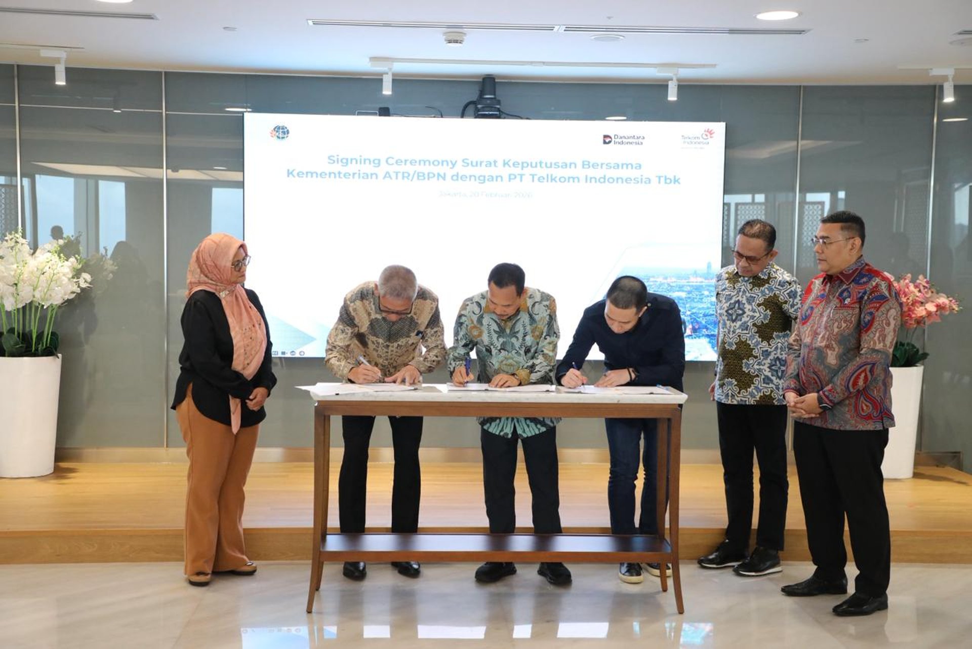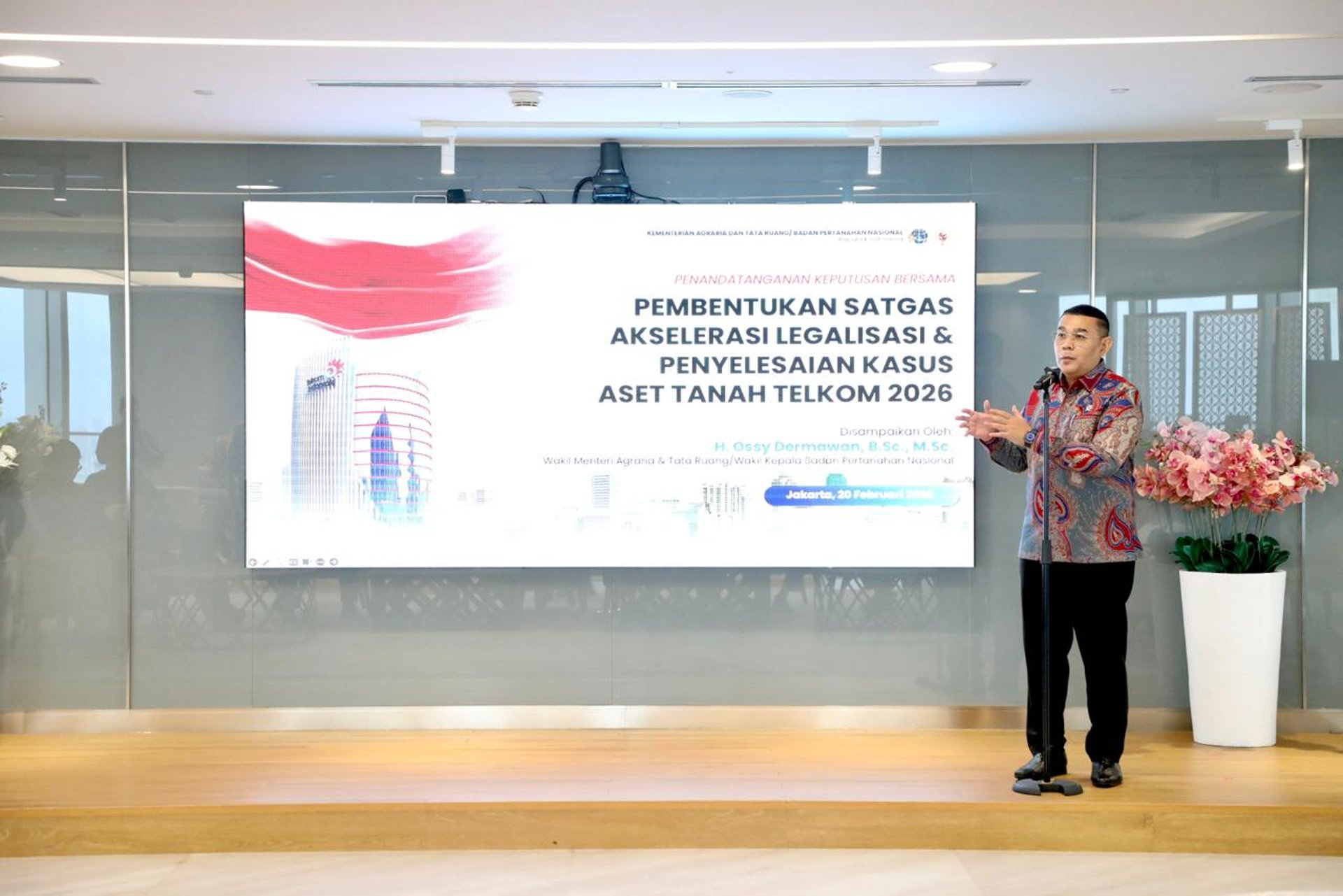 Jakarta - Kementerian Agraria dan Tata Ruang/Badan Pertanahan Nasional (ATR/BPN) bersama PT Telkom Indonesia membentuk Satgas Akselerasi Legalisasi dan Penyelesaian Kasus Aset Tanah Telkom 2026. Pembentukan Satgas disahkan melalui penandatanganan Surat Keputusan Bersama dengan disaksikan oleh Wakil Menteri (Wamen) ATR/Wakil Kepala (Waka) BPN, Ossy Dermawan dan Direktur Utama PT Telkom Indonesia, Dian Siswarini pada Jumat (20/02/2026), di Gedung Telkom Hub, Jakarta.