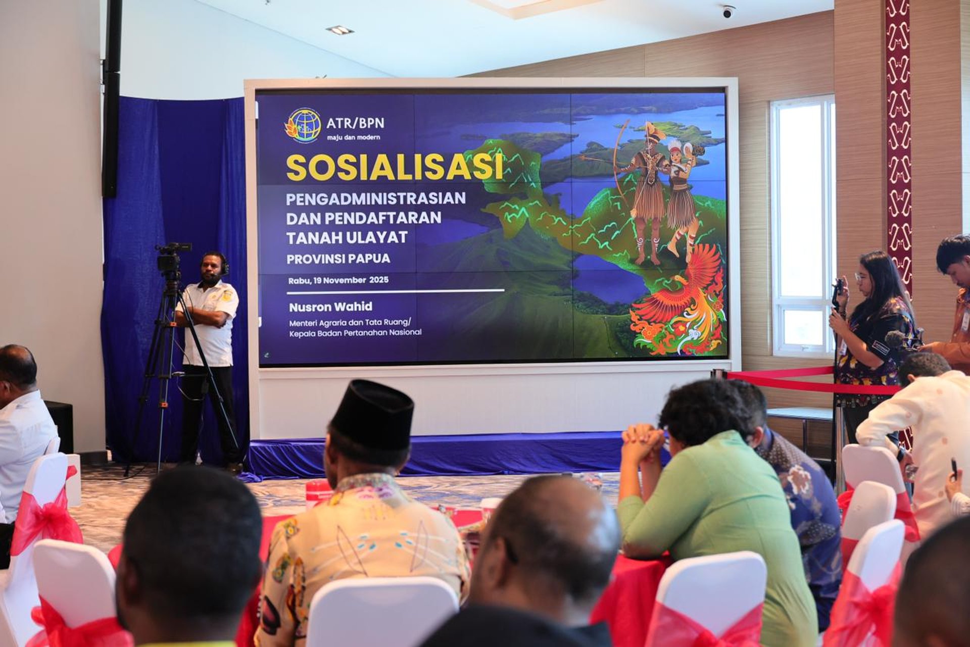 Pada kunjungan perdananya di Papua, Menteri Nusron didampingi oleh Staf Khusus Menteri Bidang Reforma Agraria, Rezka Oktoberia; Kepala Biro Hubungan Masyarakat (Humas) dan Protokol, Shamy Ardian; Direktur Pengaturan Tanah Pemerintah, Tanah Ulayat, dan Tanah Komunal, Suwito; serta Kepala Kantor Wilayah BPN Provinsi Papua, Roy Eduard Fabian Wayoi. Turut hadir dalam sosialisasi, sejumlah pimpinan daerah tingkat II se-Provinsi Papua beserta Forkopimda Provinsi Papua. (JM/RT)(21/11/2025)