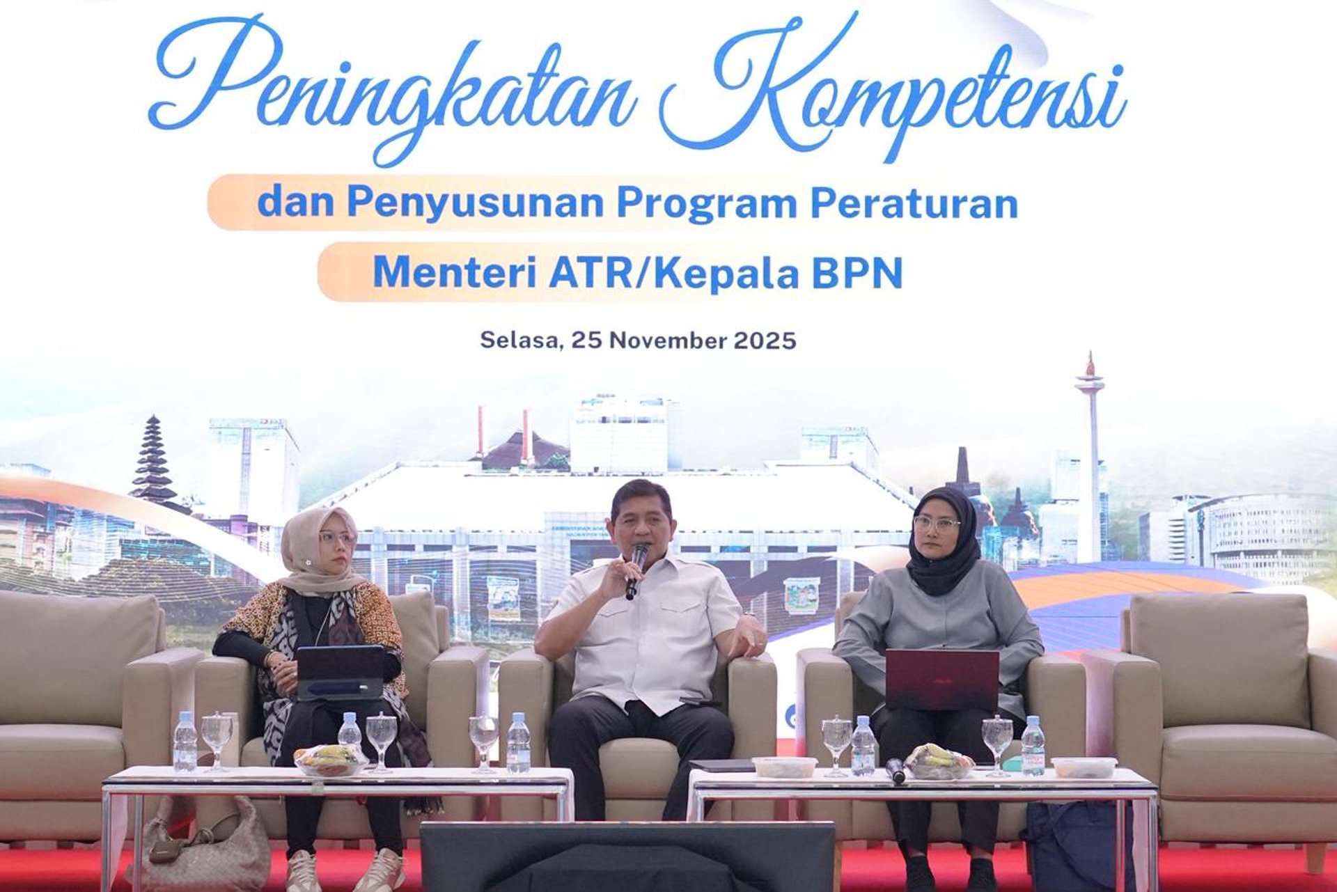 Jakarta - Kementerian Agraria dan Tata Ruang/Badan Pertanahan Nasional (ATR/BPN) menyelenggarakan Focus Group Discussion (FGD) Peningkatan Kompetensi Sumber Daya Manusia (SDM) di Bidang Pembentukan Peraturan Perundang-undangan dan Pembahasan Usulan Rancangan Peraturan Menteri Tahun 2026, Selasa (25/11/2025). Forum yang berlangsung di Aula Prona Kementerian ATR/BPN, Jakarta ini, dimaksudkan untuk memperkuat kompetensi SDM dalam merancang regulasi pertanahan dan tata ruang yang lebih responsif terhadap kebutuhan masyarakat, khususnya rakyat kecil.