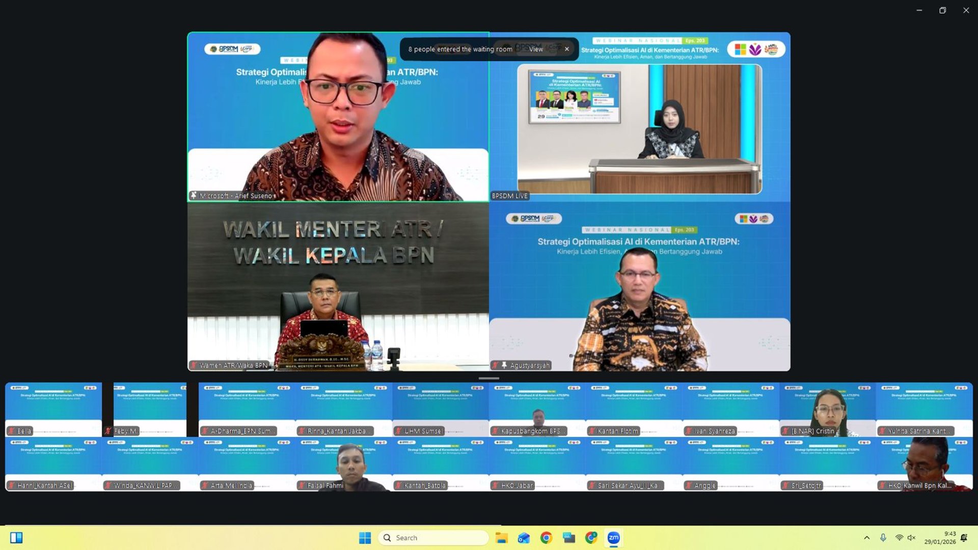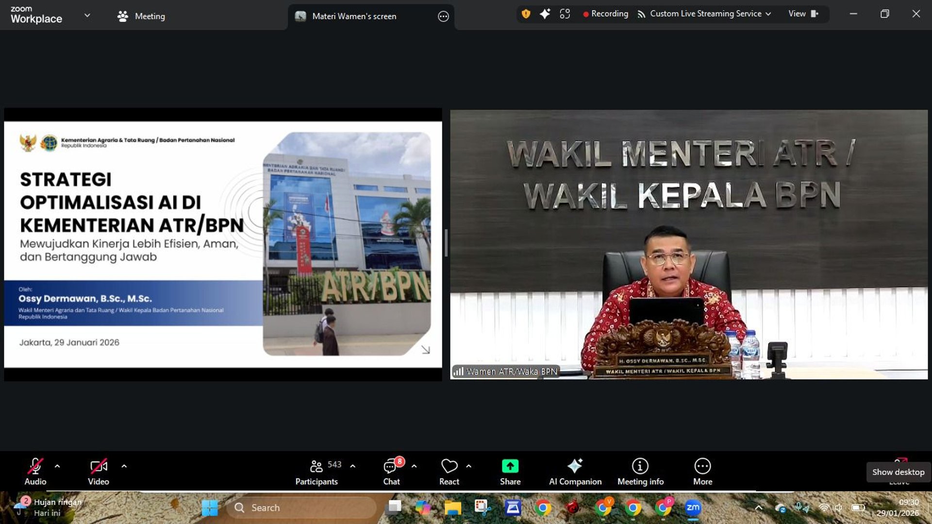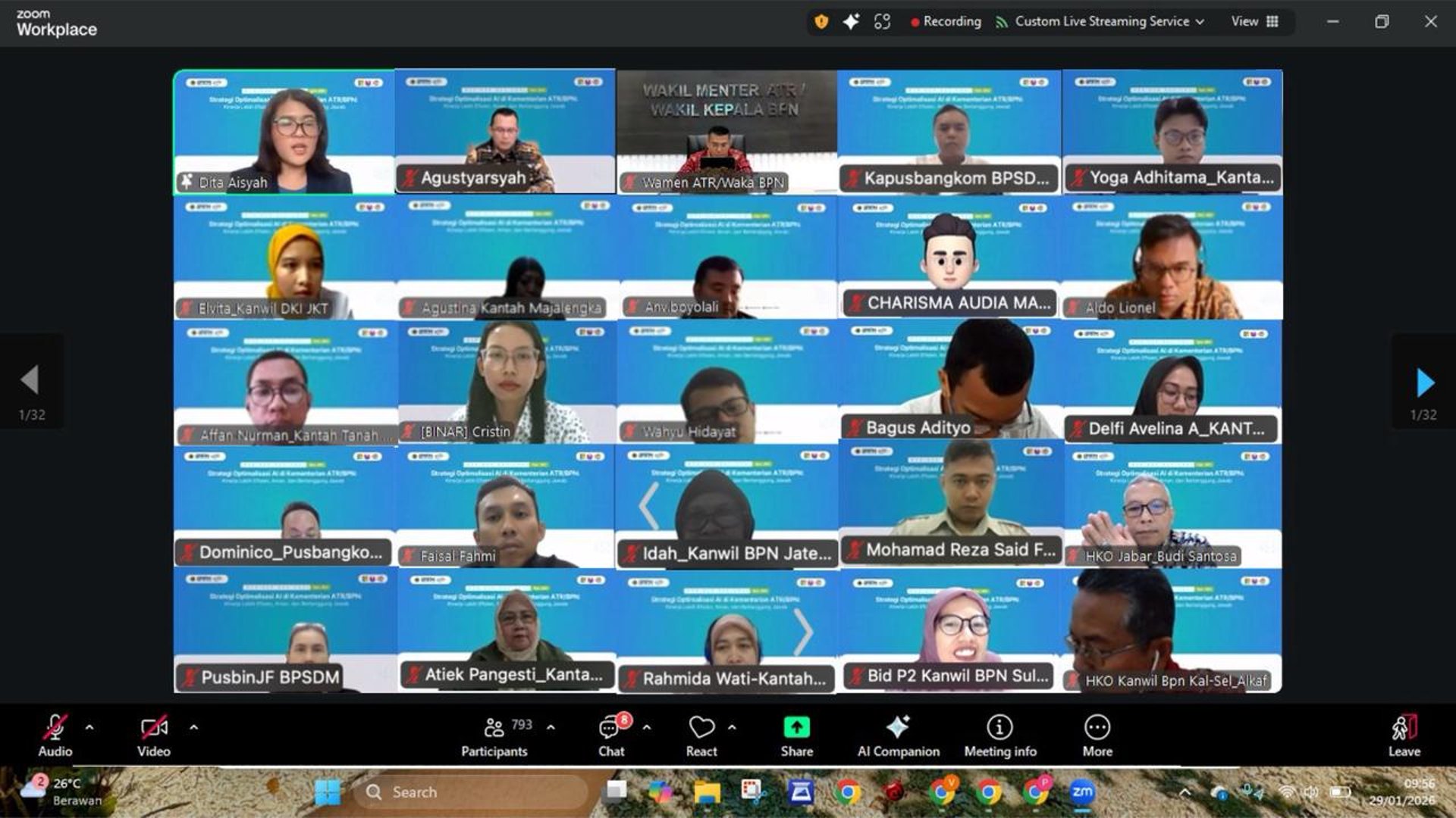 Jakarta – Wakil Menteri Agraria dan Tata Ruang/Wakil Kepala Badan Pertanahan Nasional (Wamen ATR/Waka BPN), Ossy Dermawan, membuka webinar bertajuk Strategi Optimalisasi AI di Kementerian ATR/BPN: Kinerja Lebih Efisien, Aman, dan Bertanggung Jawab yang diselenggarakan oleh Badan Pengembangan Sumber Daya Manusia (BPSDM) Kementerian ATR/BPN, pada Kamis (29/01/2026). Dalam sambutannya, ia mengatakan pemanfaatan Artificial Intelligence (AI) dinilai memiliki potensi besar dalam menunjang pengelolaan data pertanahan dan tata ruang di lingkungan Kementerian ATR/BPN.
